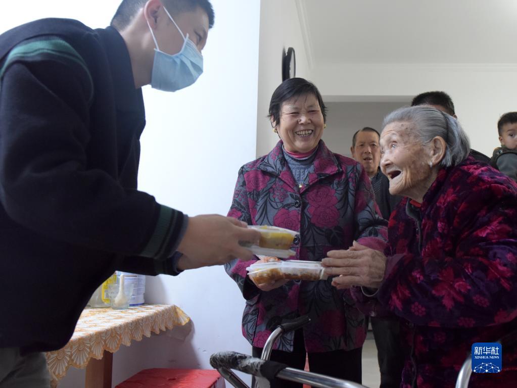 11月22日,安徽省合肥市肥東縣店埠鎮迎河家園內,肥東縣老年助餐服務(wù)中心經(jīng)理李杰(左)在給102歲的老人朱廣珍(右一)送上午餐。