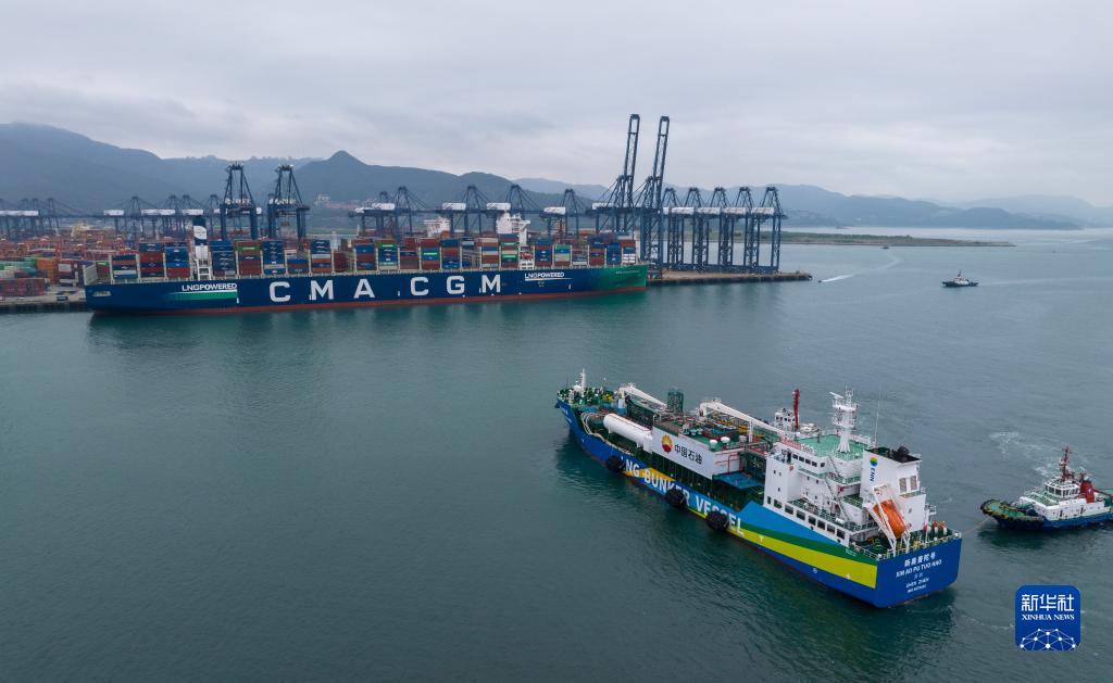 11月22日,在深圳鹽田港,C型罐式LNG加注船“新奧普陀號”駛向法國達飛集團的雙燃料集裝箱船“達飛·索邦”號(無(wú)人機照片)。