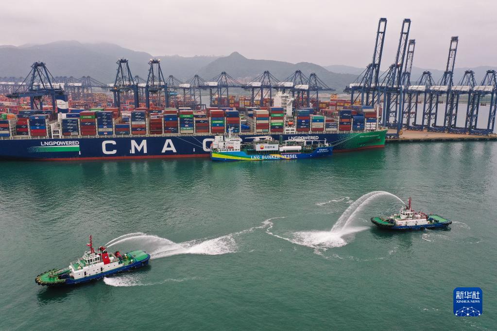 11月22日,在深圳鹽田港,C型罐式LNG加注船“新奧普陀號”為法國達飛集團的雙燃料集裝箱船“達飛·索邦”號加注LNG燃料(無(wú)人機照片)。