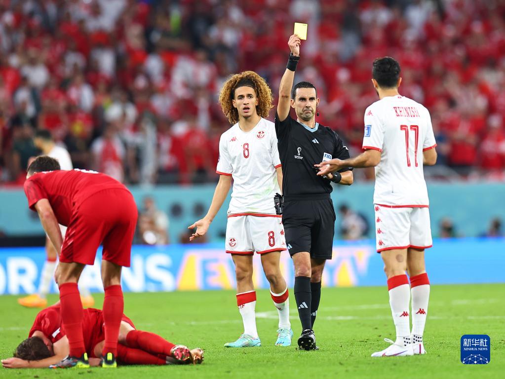 11月22日,裁判向突尼斯隊球員塔哈·赫尼希(右一)出示黃牌。