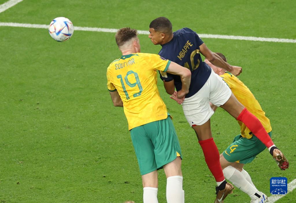 11月22日,法國隊球員姆巴佩(中)在比賽中頭球得分。