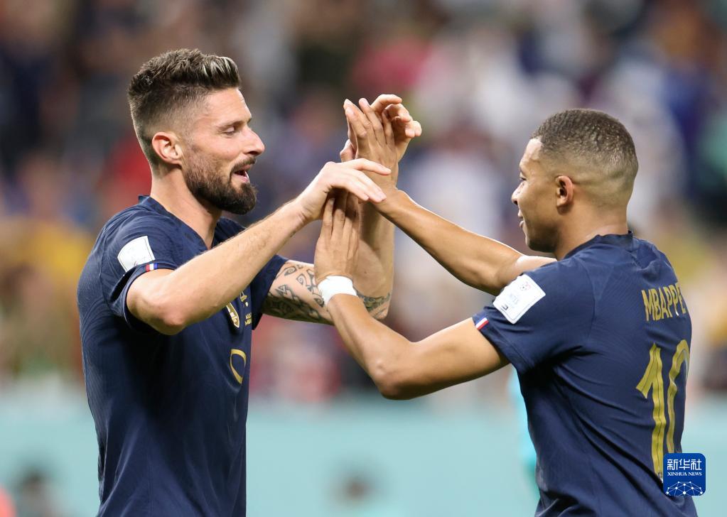 11月22日,法國隊球員吉魯(左)與隊友姆巴佩慶祝進(jìn)球。