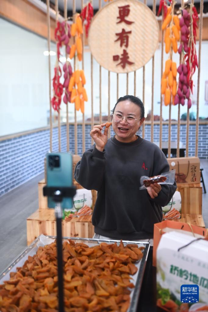 11月23日,黨員志愿者在浙江省建德市更樓街道橋嶺村共富工坊的直播間里進(jìn)行網(wǎng)上直播銷(xiāo)售地瓜干。