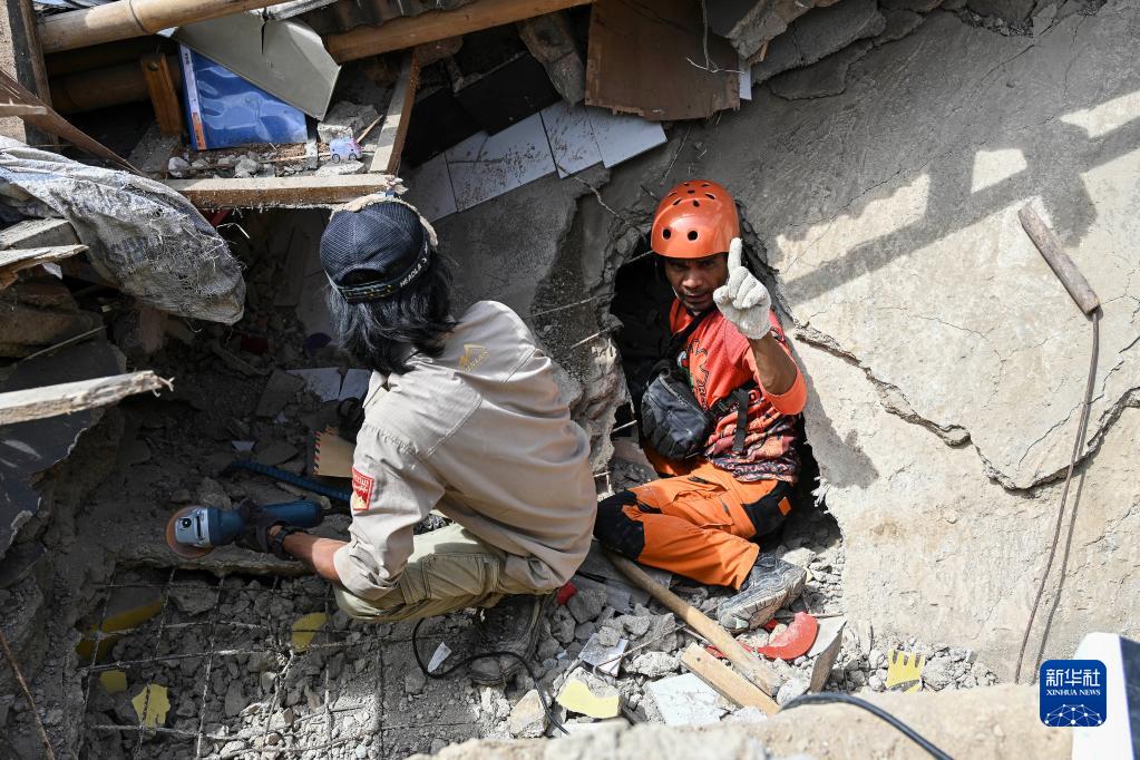 11月23日,救援人員在印度尼西亞西爪哇省展玉地區地震受損建筑的廢墟中進(jìn)行搜救。