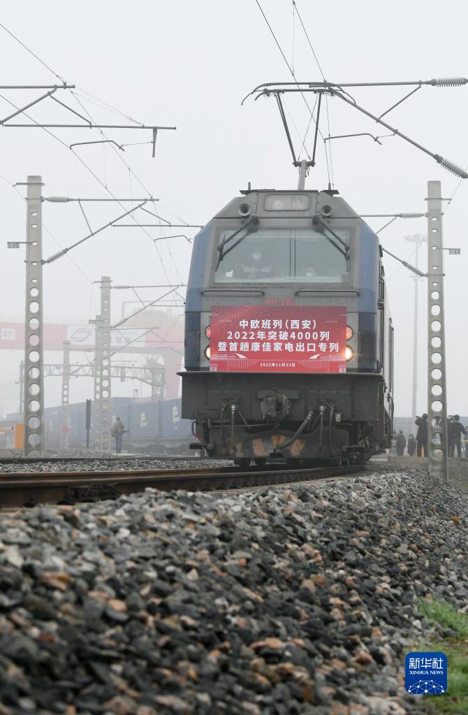 11月23日,滿(mǎn)載家電產(chǎn)品的中歐班列從西安國際港站駛出。