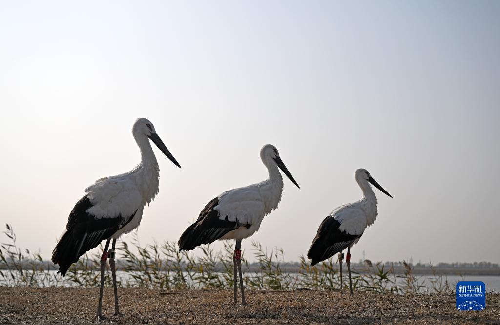 當日,天津市寧河區林業(yè)局將3只具有野外生存能力的東方白鸛在七里海濕地放歸自然。