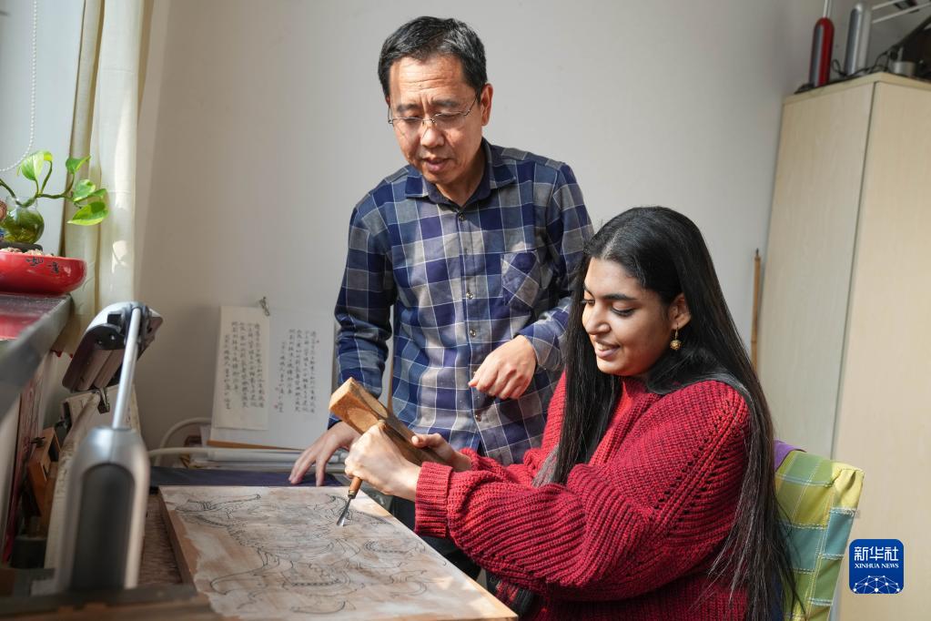 在天津楊柳青木版年畫(huà)博物館,辛格在天津市級非遺藝人劉杰的指導下體驗雕刻年畫(huà)的印版(11月17日攝)。