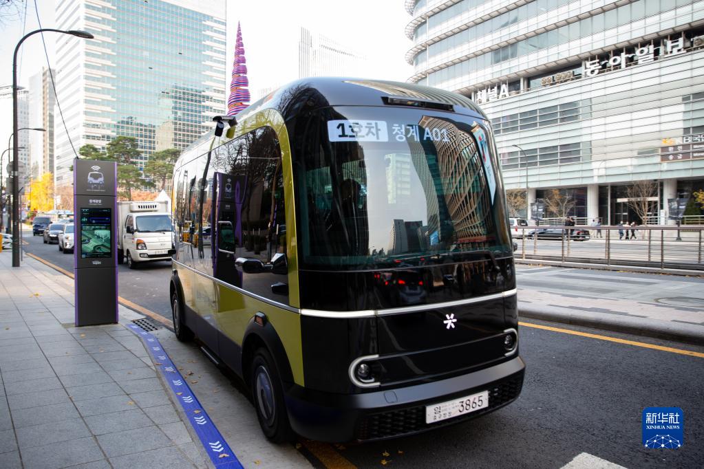 11月24日,在韓國首爾,一輛自動(dòng)駕駛巴士駛入??空军c(diǎn)。