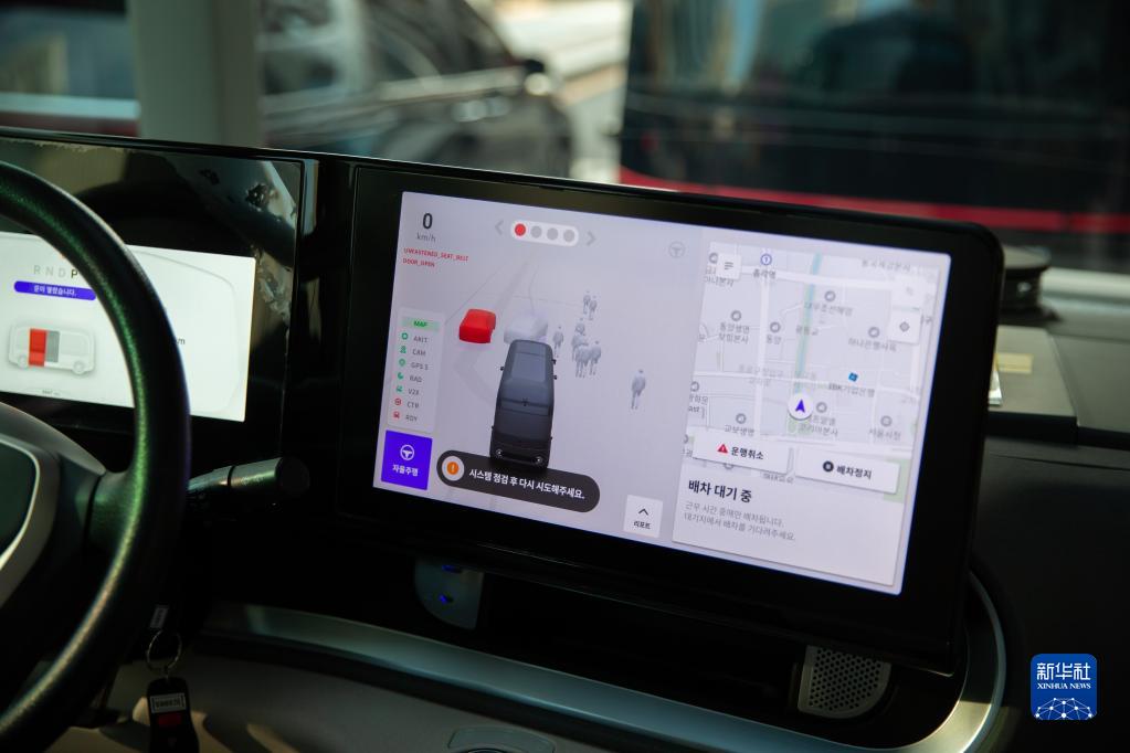 這是11月24日在韓國首爾拍攝的自動(dòng)駕駛巴士?jì)鹊娘@示屏。