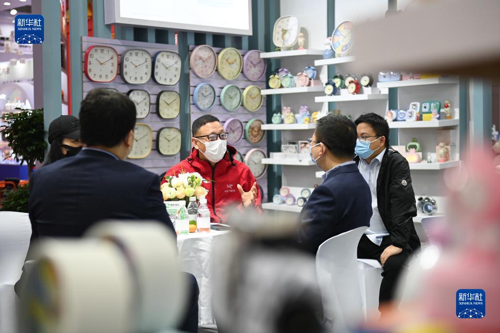 11月24日,客商在義烏市場(chǎng)建設40周年主題館的一個(gè)展區洽談。