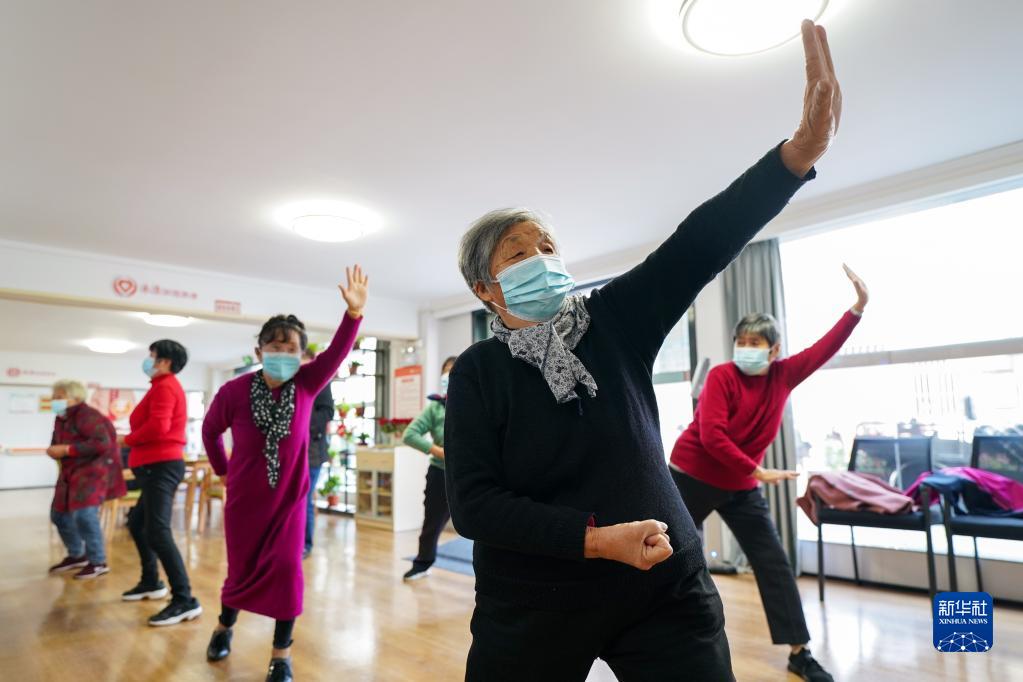 11月24日,在鹽城市亭湖區五星街道萬(wàn)戶(hù)新村居家養老服務(wù)中心,老人在跳健康操。