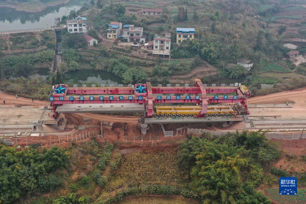這是11月24日拍攝的渝昆高鐵瀘宜段架梁施工現場(chǎng)(無(wú)人機照片)。
