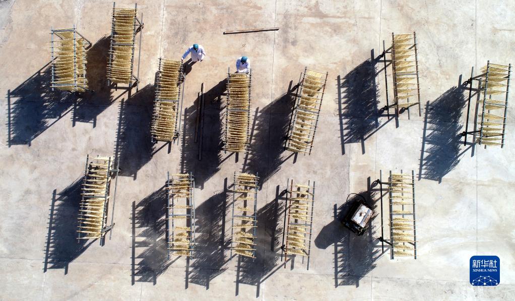 11月24日,在河北省井陘縣南王莊鄉割髭嶺村一家粉條生產(chǎn)基地,工人在曬粉(無(wú)人機照片)。