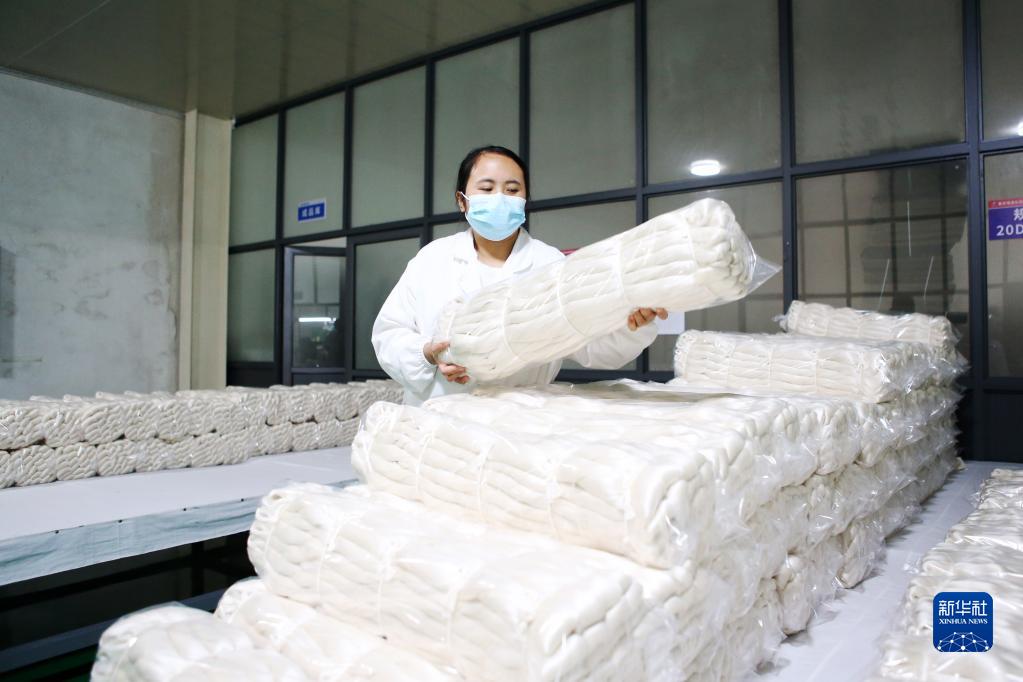11月23日,工人在重慶市黔江區一家絲綢公司倉庫整理生絲。