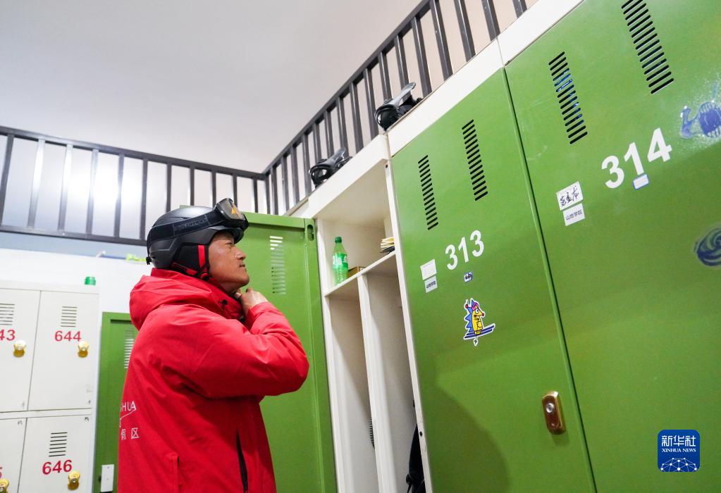 張占華在吉林市萬(wàn)科松花湖度假區更換滑雪裝備(11月20日攝)。38歲的張占華是吉林市永吉縣北大湖鎮官地村村民。2016年開(kāi)始,他利用冬天農閑時(shí)間來(lái)到吉林市萬(wàn)科松花湖度假區做滑雪教練。