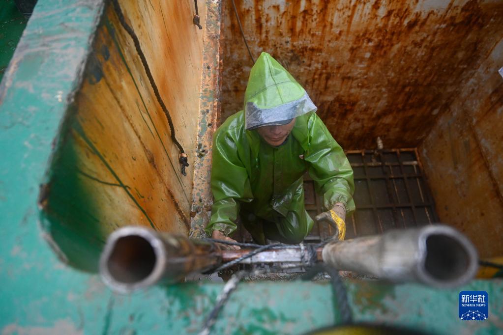 11月25日,在福州連江縣苔菉鎮后灣海域,漁民下到運輸船船艙里作業(yè)。