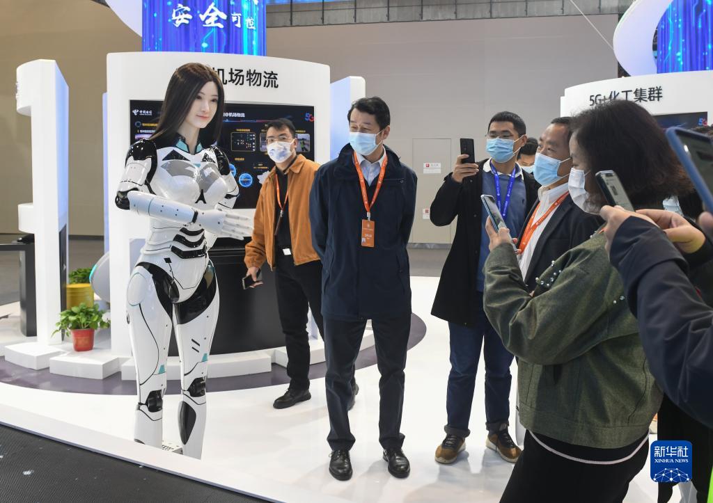11月20日,參觀(guān)者在與一款高仿人機器人互動(dòng)。
