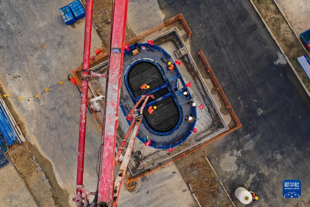 11月26日,中鐵四局施工人員在新建滬寧合高鐵安徽段首根墩身澆筑現場(chǎng)作業(yè)(無(wú)人機照片)。