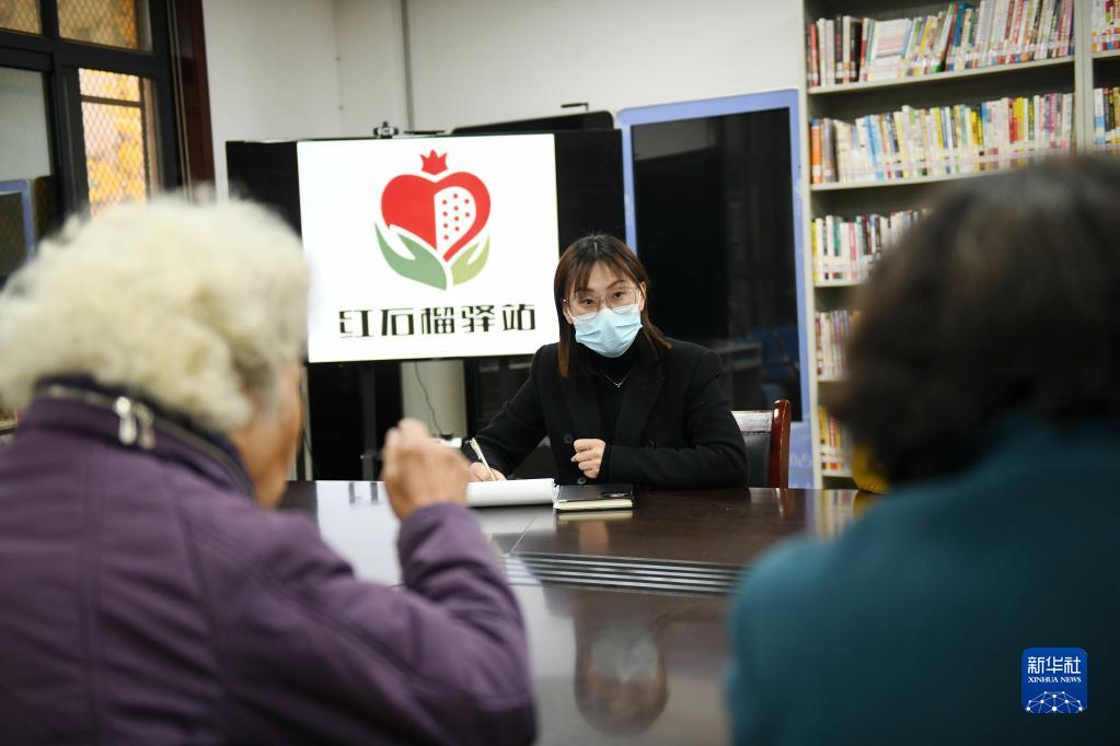 11月17日,西安市雁塔區電子城街道二〇五所社區黨支部書(shū)記于珍(中)在紅石榴驛站接待兩位社區居民,幫助解決她們的房屋供暖等問(wèn)題。