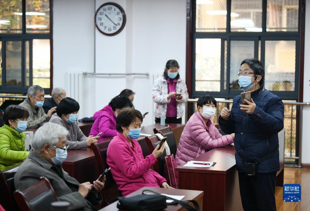 11月17日,在西安市雁塔區電子城街道二〇五所社區,社區科普大學(xué)老師(右一)為社區居民講授手機視頻剪輯課程。