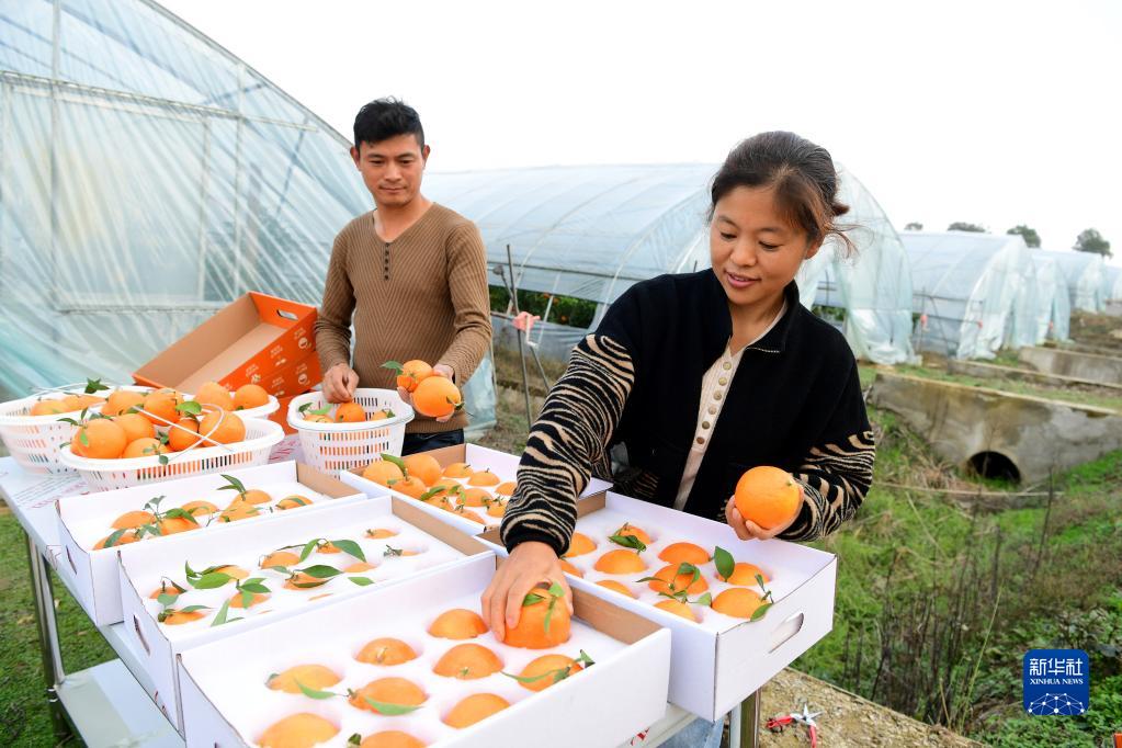 11月26日,村民在肥西縣銘傳鄉王井社區特色蔬果產(chǎn)業(yè)園內包裝剛采摘的“紅美人”柑橘。