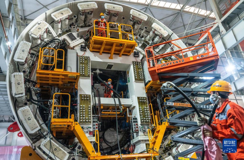 11月23日,工人在中鐵裝備集團車(chē)間內進(jìn)行掘進(jìn)機主機拆機作業(yè),以便出口運輸。