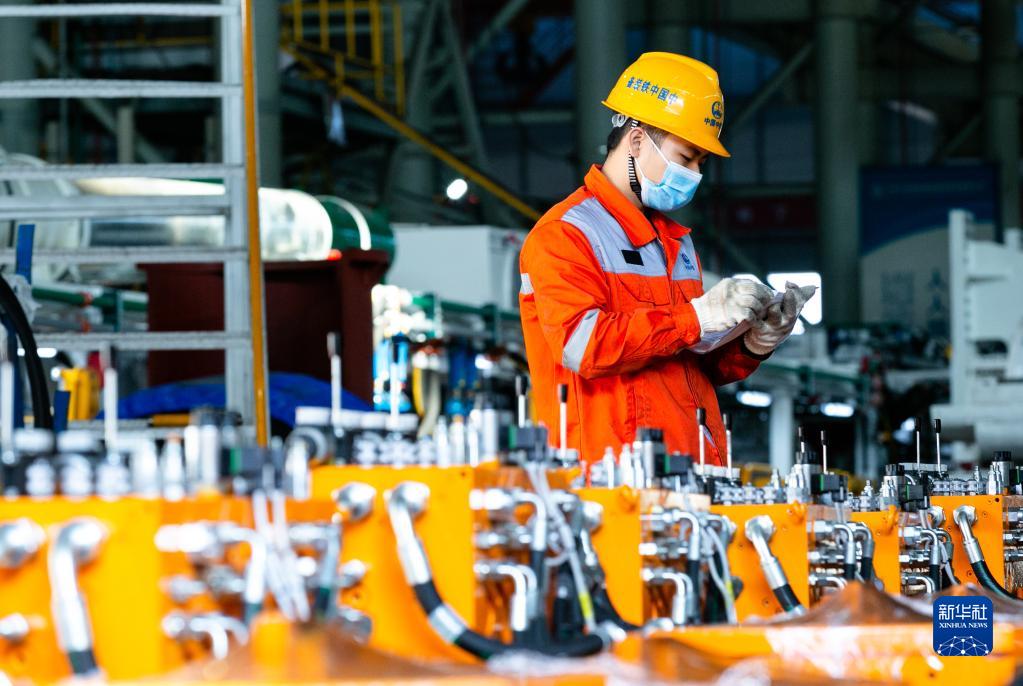 11月24日,工人在中鐵裝備集團車(chē)間內檢查自制注漿泵液壓系統安裝情況。