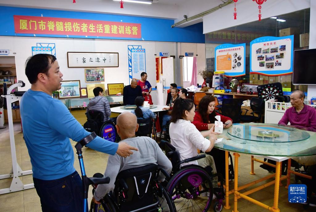 在廈門(mén)中途之家脊髓損傷者服務(wù)中心,謝啟明(左一)與“輪椅跑友”交流心得(11月26日攝)。