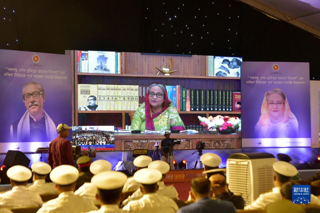 11月26日,在孟加拉國吉大港市舉行的卡納普里河底隧道項目南線(xiàn)隧道竣工儀式上,孟加拉國總理哈西娜在線(xiàn)發(fā)表講話(huà)。