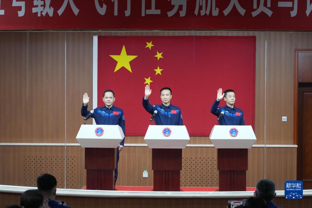 11月28日,執行神舟十五號載人飛行任務(wù)的航天員乘組費俊龍(中)、鄧清明(右)、張陸在酒泉衛星發(fā)射中心問(wèn)天閣與中外媒體記者集體見(jiàn)面,并回答記者提問(wèn)。