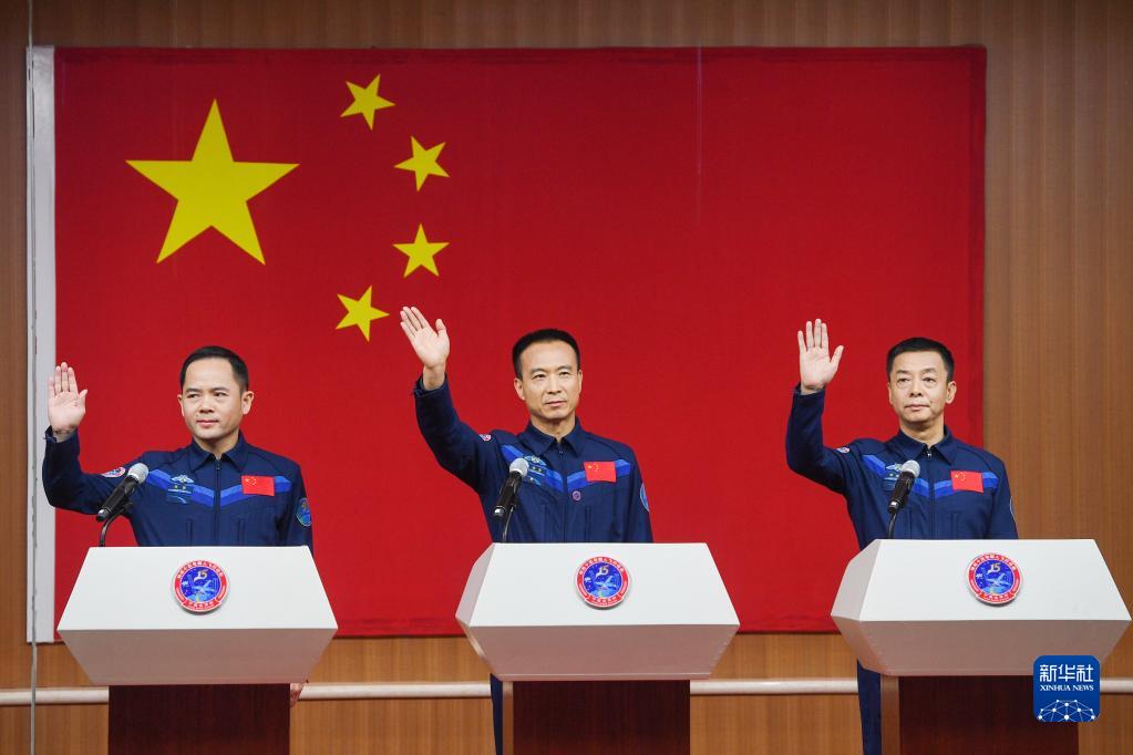 11月28日,執行神舟十五號載人飛行任務(wù)的航天員乘組費俊龍(中)、鄧清明(右)、張陸在酒泉衛星發(fā)射中心問(wèn)天閣與中外媒體記者集體見(jiàn)面,并回答記者提問(wèn)。