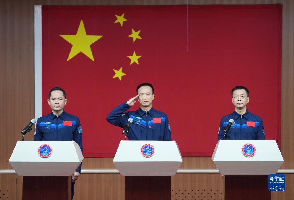 11月28日,執行神舟十五號載人飛行任務(wù)的航天員乘組費俊龍(中)、鄧清明(右)、張陸在酒泉衛星發(fā)射中心問(wèn)天閣與中外媒體記者集體見(jiàn)面,并回答記者提問(wèn)。