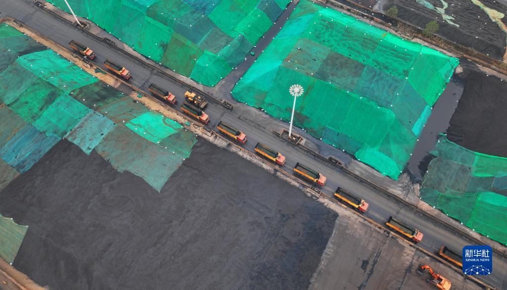 11月28日,在江蘇連云港港煤炭碼頭,車(chē)輛在轉運到港的電煤(無(wú)人機照片)。