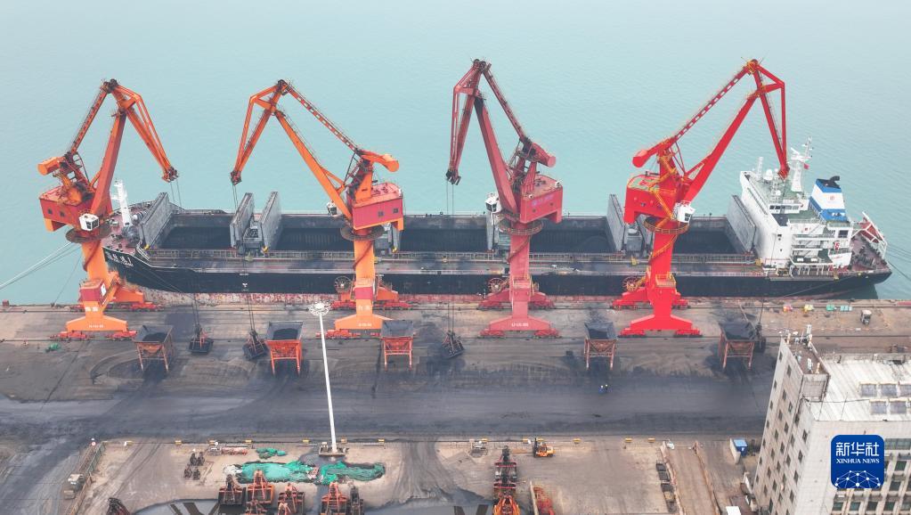 11月28日,在江蘇連云港港煤炭碼頭,貨輪在卸載到港的電煤(無(wú)人機照片)。