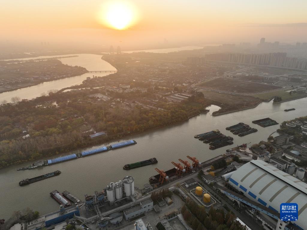 11月28日,運輸電煤的船舶經(jīng)過(guò)京杭大運河揚州段(無(wú)人機照片)。