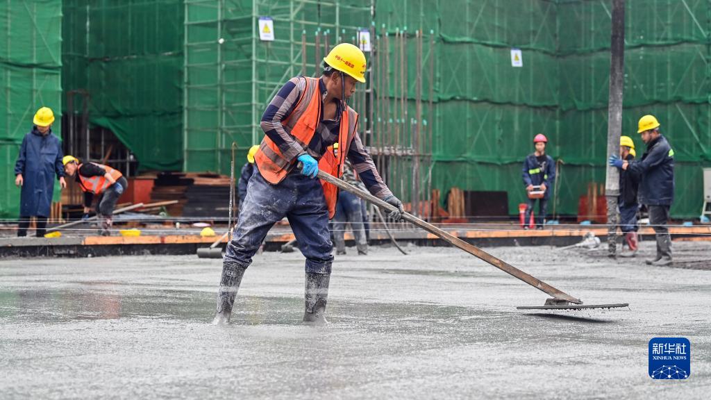 在玉林北站工地,工人將澆筑的混凝土鋪平(11月26日攝)。