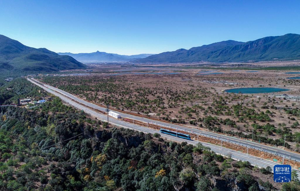 11月28日,觀(guān)光火車(chē)行駛在麗江觀(guān)光火車(chē)一期工程鐵路線(xiàn)上(無(wú)人機照片)。
