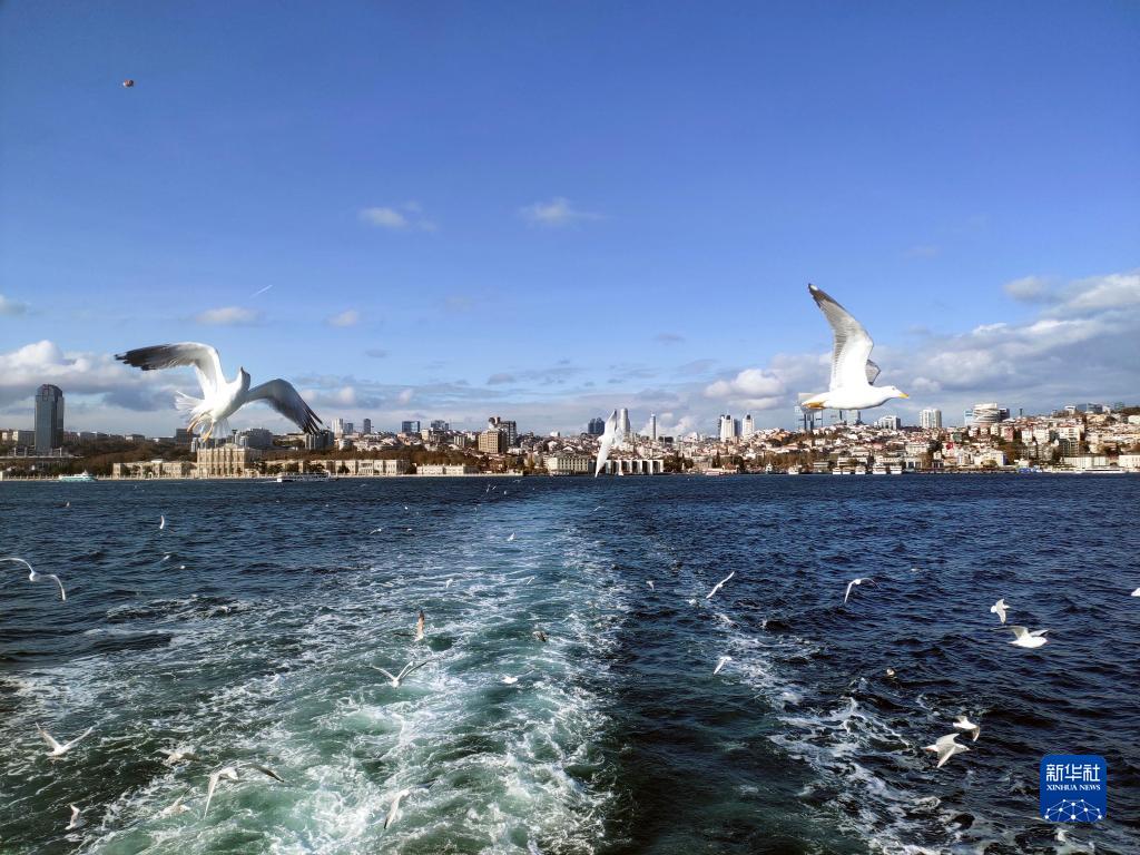 11月27日,海鷗在土耳其博斯普魯斯海峽的水面上覓食。