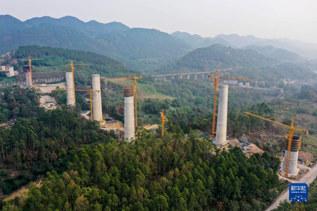 這是11月28日拍攝的渝昆高鐵川渝段華福特大橋施工作業(yè)現場(chǎng)(無(wú)人機照片)。