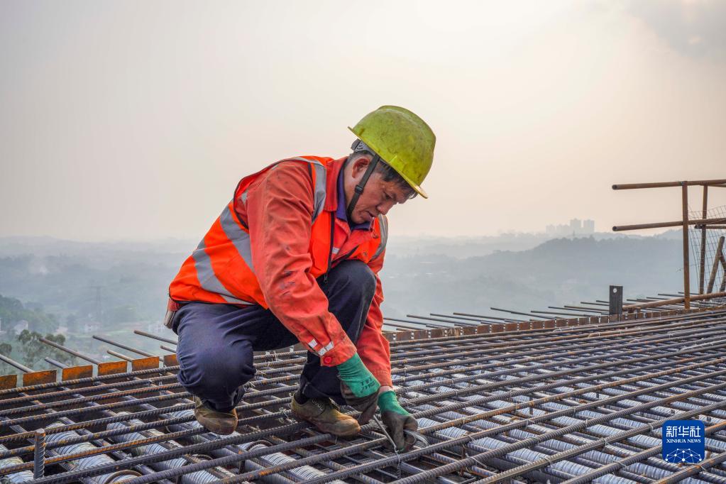 11月28日,工人在渝昆高鐵川渝段華福特大橋施工現場(chǎng)作業(yè)。