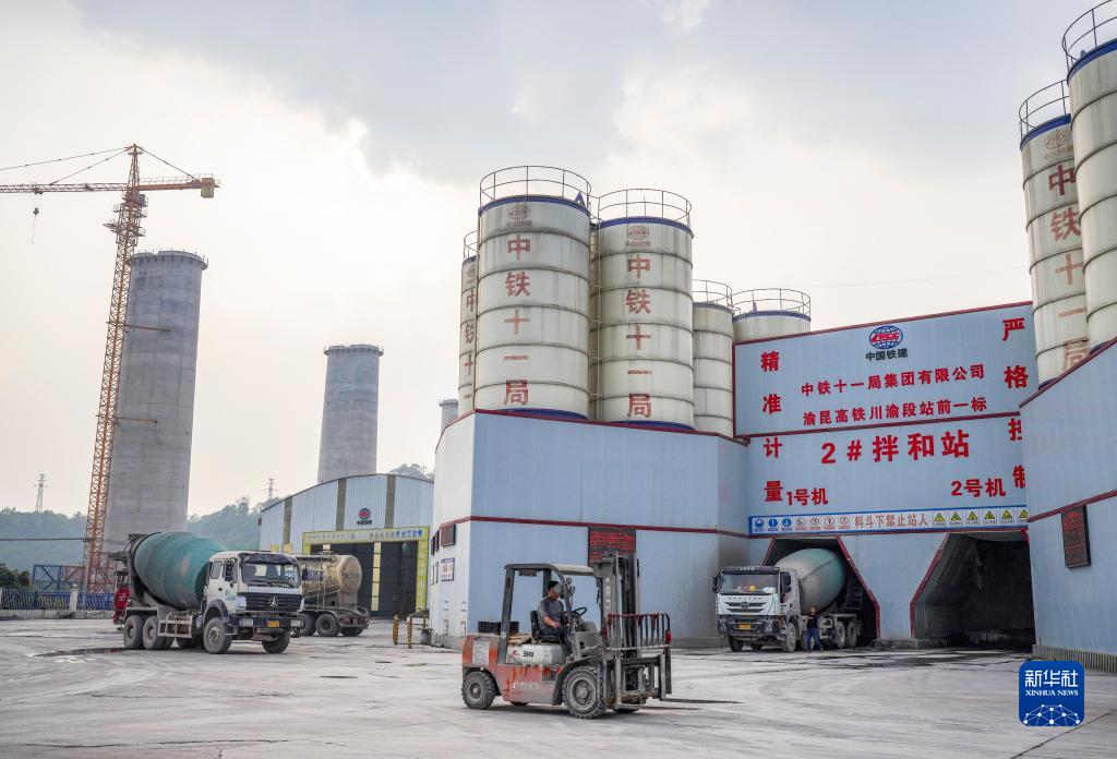 這是11月28日拍攝的渝昆高鐵川渝段站前一標2號拌和站作業(yè)現場(chǎng)。