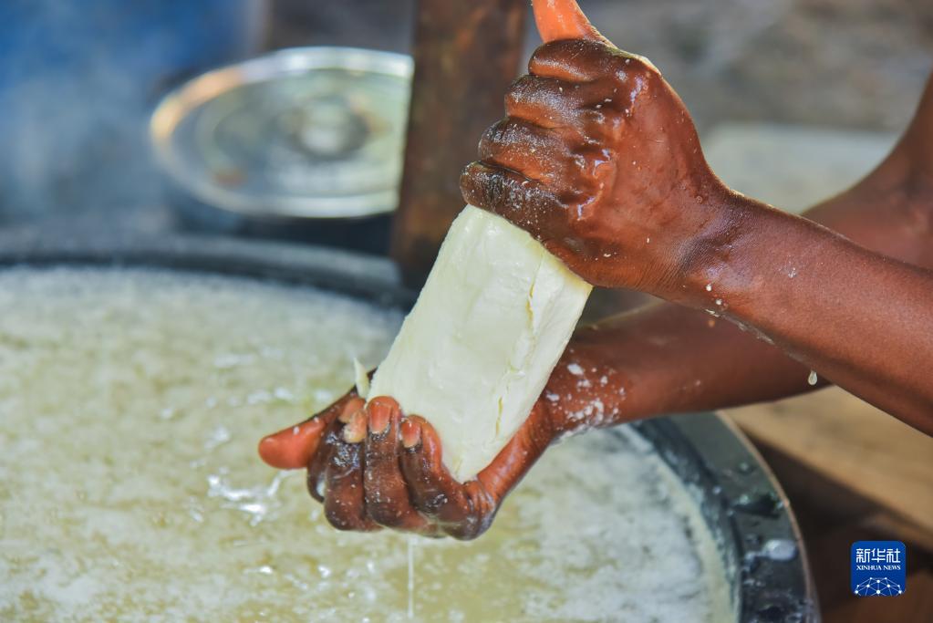 木薯是喀麥隆百姓重要的傳統糧食作物。成熟的木薯塊根經(jīng)過(guò)清洗、削皮、切碎,再放入水中發(fā)酵,根據發(fā)酵時(shí)間的不同,木薯碎根可以制成不同的衍生品,比如木薯棒和木薯“古斯古斯”。