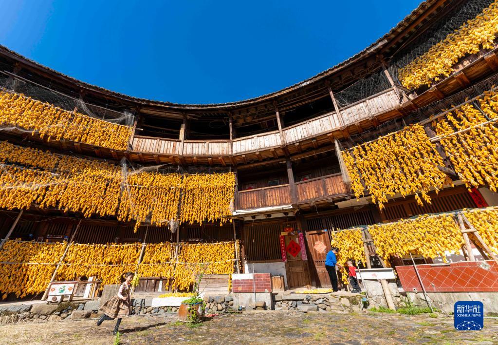 11月29日在漳州市南靖縣梅林鎮梅林村拍攝的掛滿(mǎn)玉米的土樓。