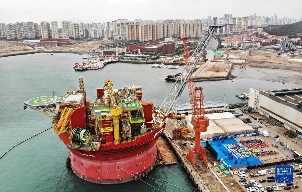 這是11月29日在山東青島拍攝的企鵝圓筒型浮式生產(chǎn)儲卸油裝置(FPSO)交付現場(chǎng)(無(wú)人機照片)。