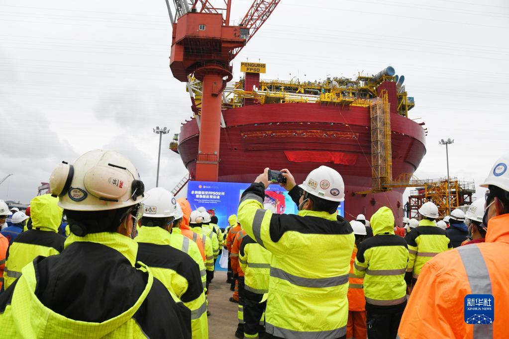 這是11月29日在山東青島拍攝的企鵝圓筒型浮式生產(chǎn)儲卸油裝置(FPSO)交付儀式現場(chǎng)。
