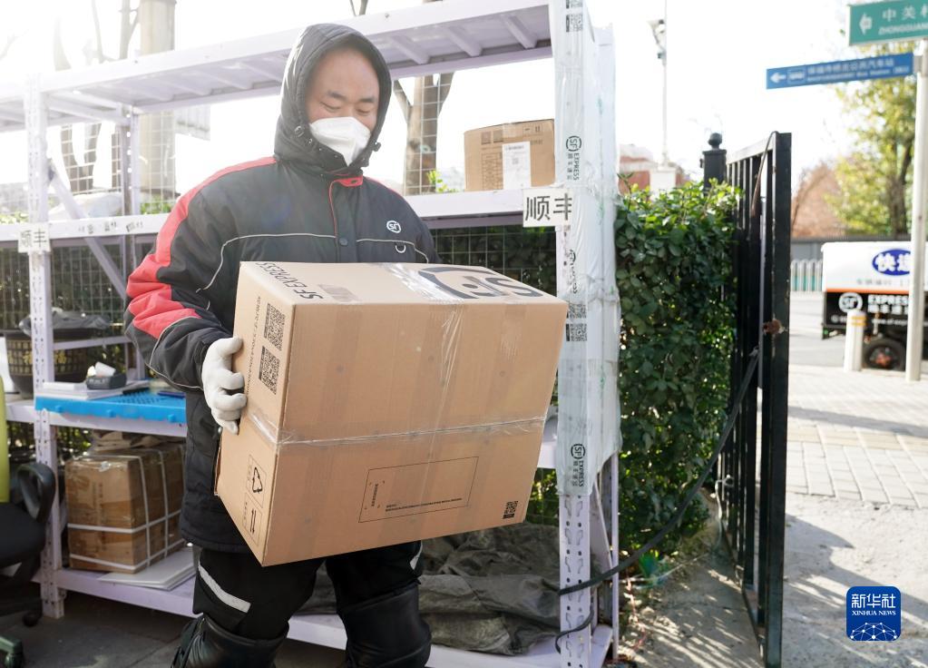 11月29日,在北京市海淀區中關(guān)村街道一處快遞點(diǎn),快遞員在寒風(fēng)中搬運快遞。