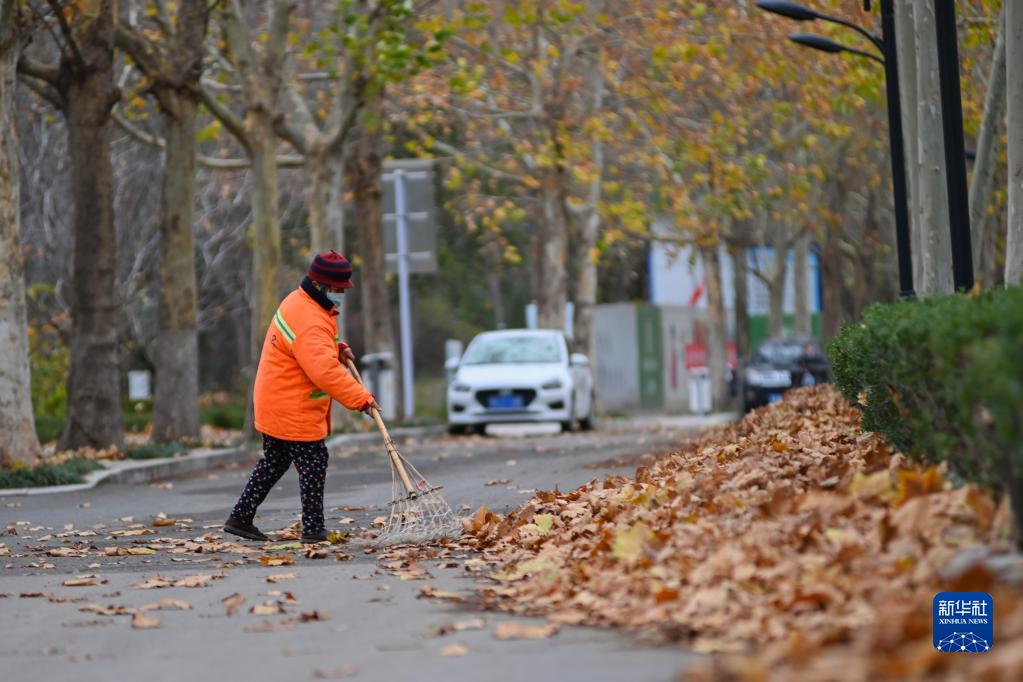 11月29日,環(huán)衛工人在山東省青州市街頭清掃落葉。
