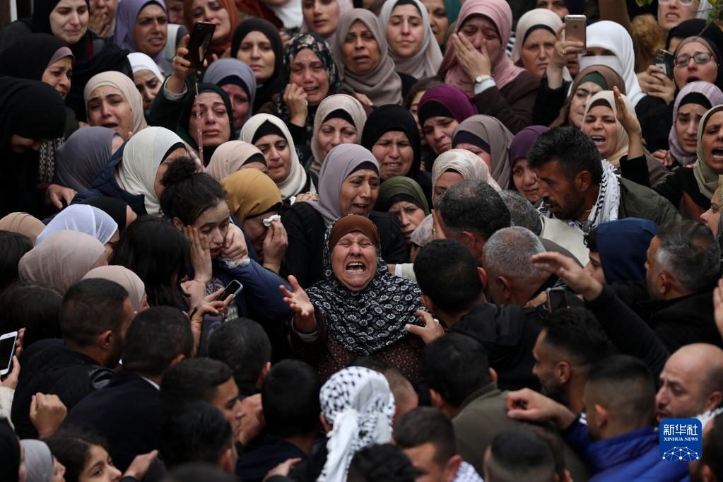 11月29日,在約旦河西岸城市拉姆安拉附近的拜特里馬,人們參加被以色列軍隊打死的巴勒斯坦人的葬禮。新華社發(fā)(艾曼·努巴尼攝)