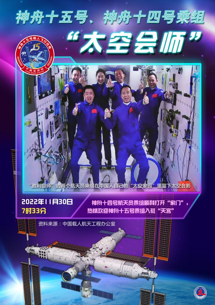 完成各項準備后,11月30日7時(shí)33分,翹盼已久的神舟十四號航天員乘組順利打開(kāi)“家門(mén)”,熱情歡迎遠道而來(lái)的親人入駐“天宮”。隨后,“勝利會(huì )師”的兩個(gè)航天員乘組,一起在中國人自己的“太空家園”里留下了一張足以載入史冊的太空合影。