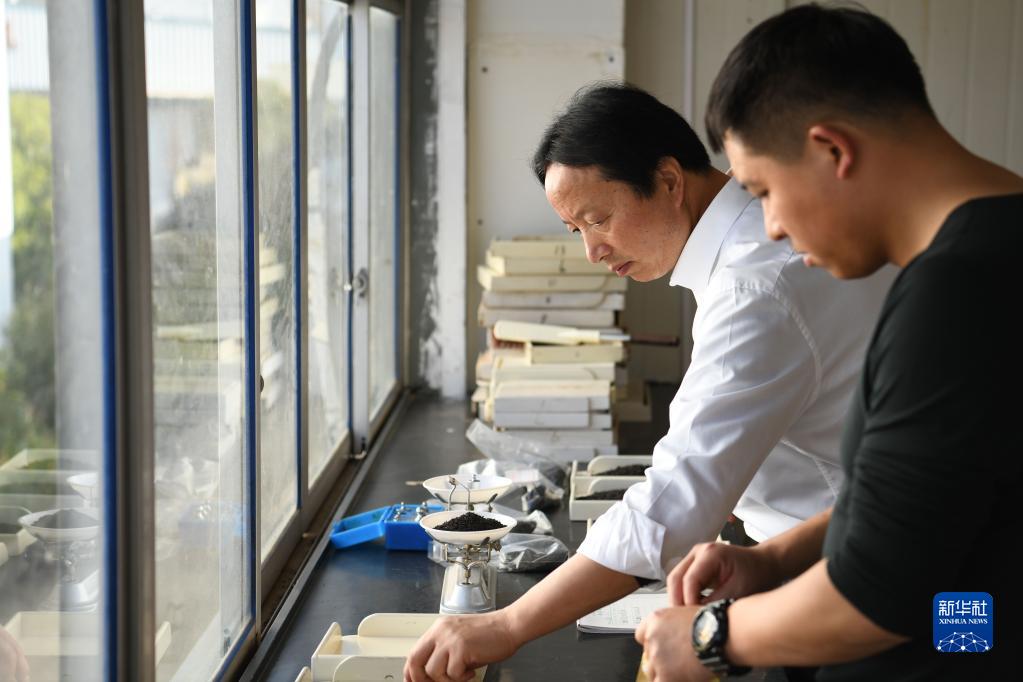 11月26日,安徽祁門(mén)紅茶制作技藝代表性傳承人王昶(左)與學(xué)生范文翰在祁門(mén)紅茶發(fā)展有限公司進(jìn)行祁門(mén)紅茶制作的拼配環(huán)節。